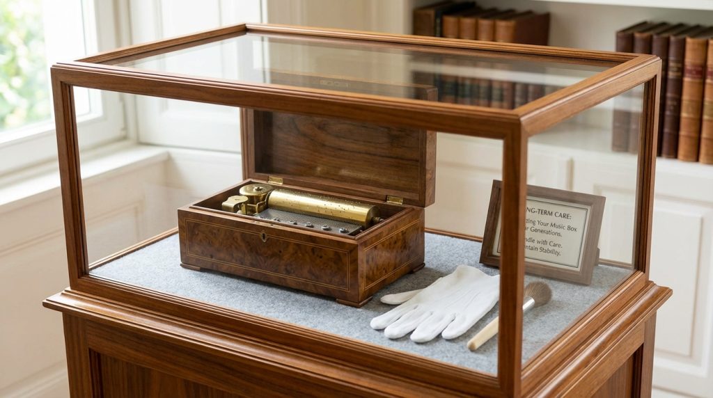 Whether displayed or stored, music boxes should be placed on stable surfaces away from vibration. Display cases should allow for air circulation while protecting from dust.