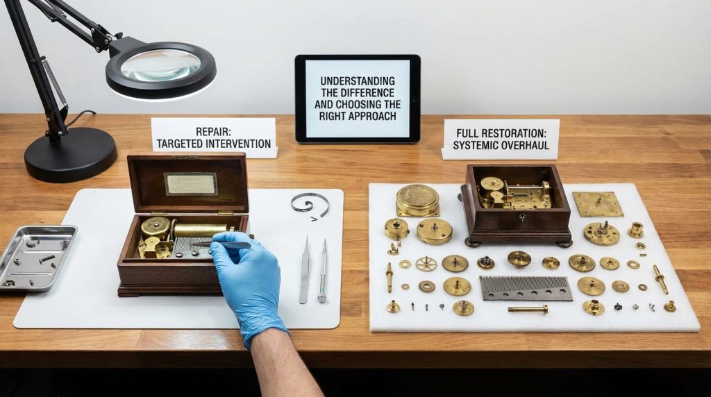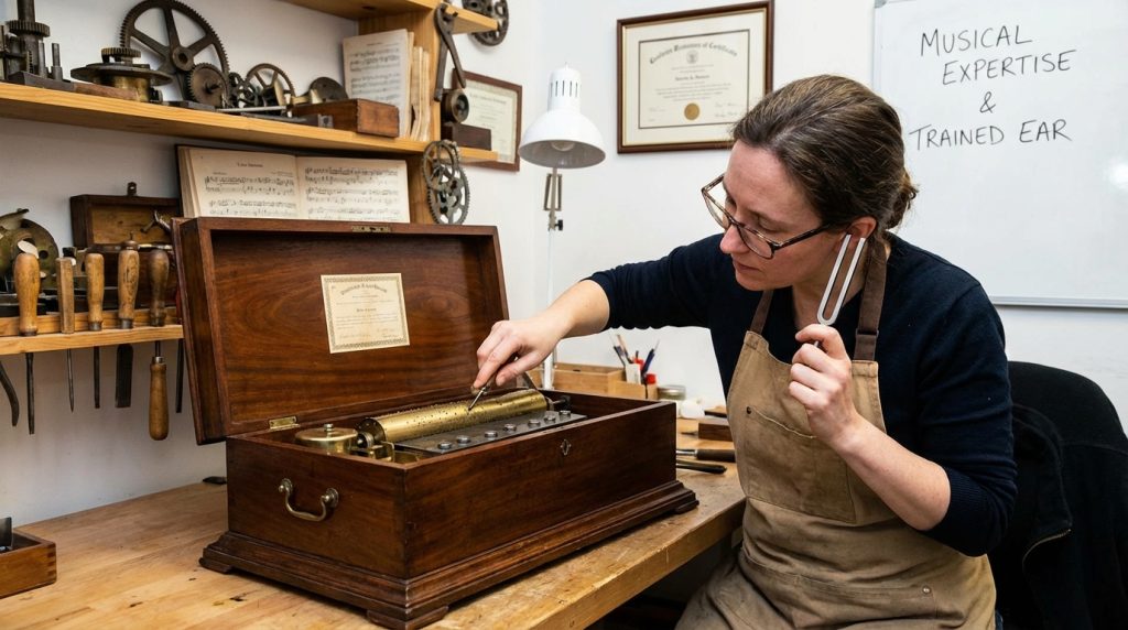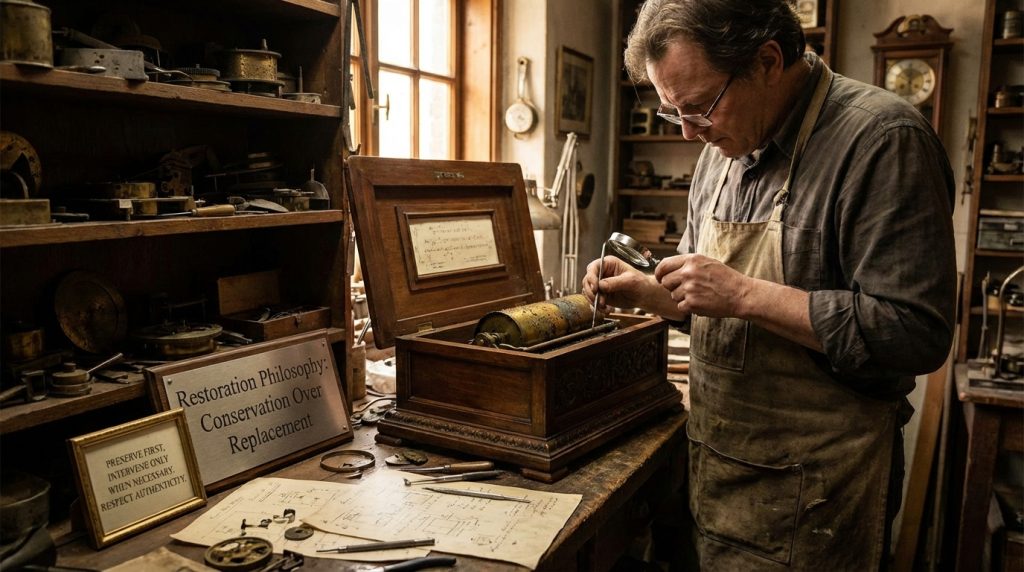 A properly restored music box should sound as it did when it first left the maker’s workshop—not reinterpreted, but faithfully preserved.