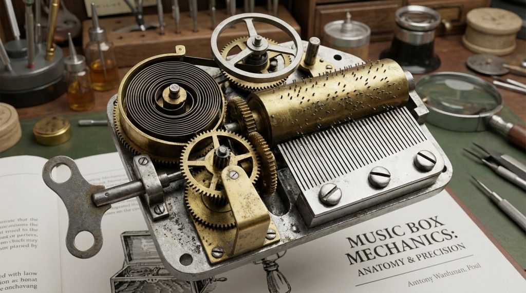 The heart of the music box is its mainspring, a tightly coiled steel spring that stores energy when the instrument is wound. As the spring unwinds, it releases power gradually through the gear train. The quality, strength, and condition of the mainspring directly influence tempo, volume, and consistency.