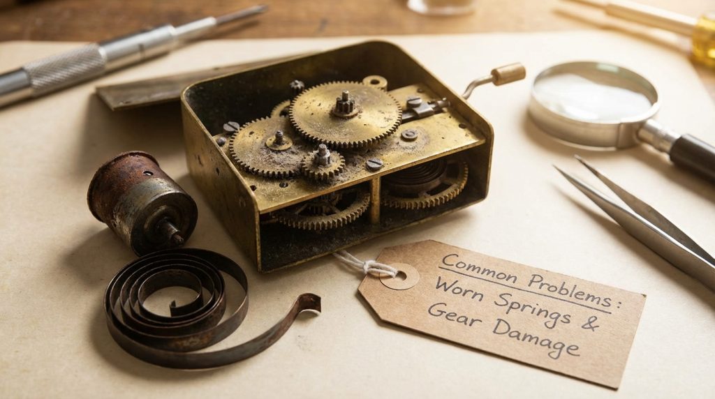 One of the most common problems in antique music boxes is mainspring fatigue. Over time, springs lose strength, develop cracks, or break entirely. A weakened spring produces uneven power, causing fluctuations in tempo, sudden stops, or excessive strain on gears and the governor.